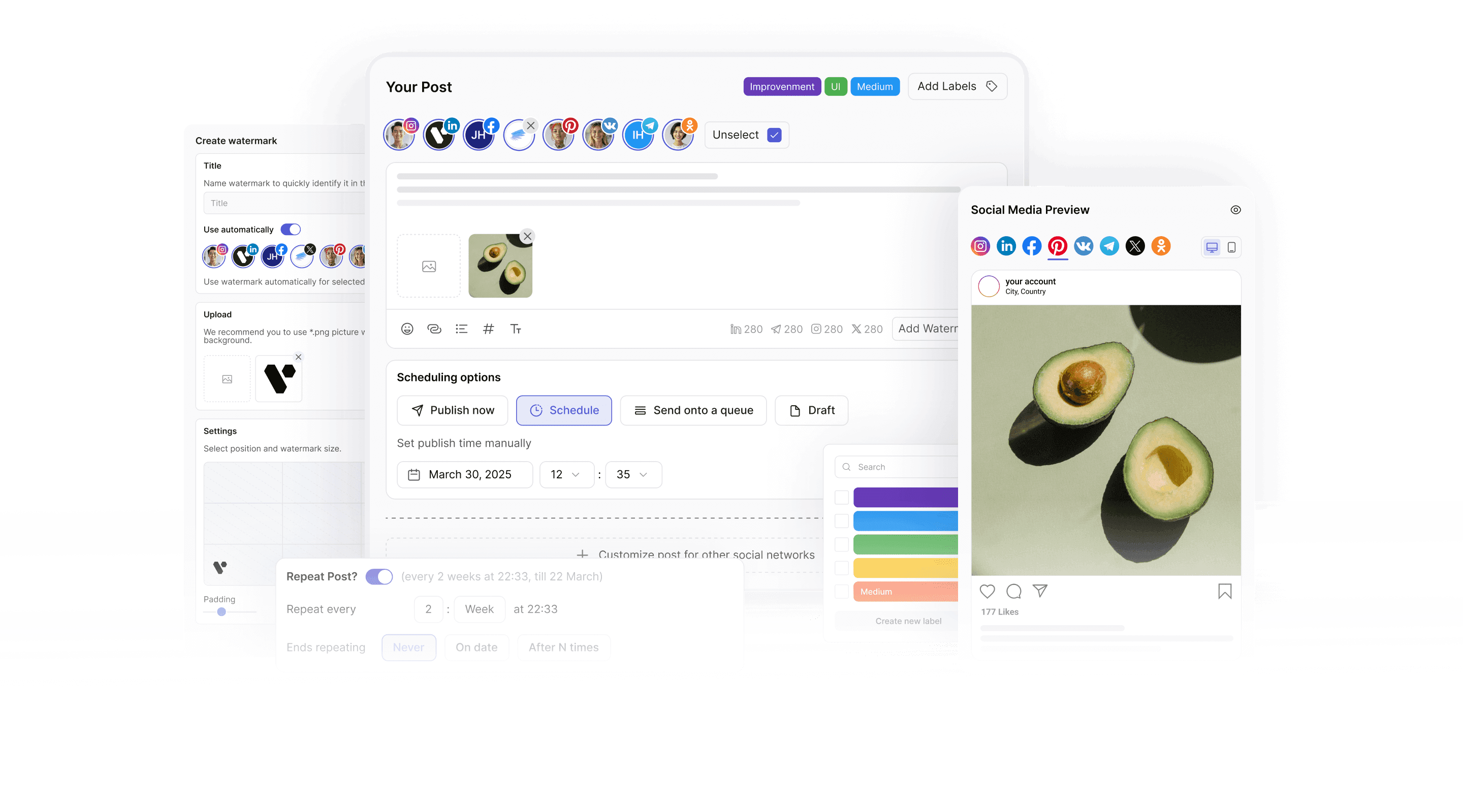 Pick the exact platform, date, and time for each post. Stay in control and always hit the perfect timing.